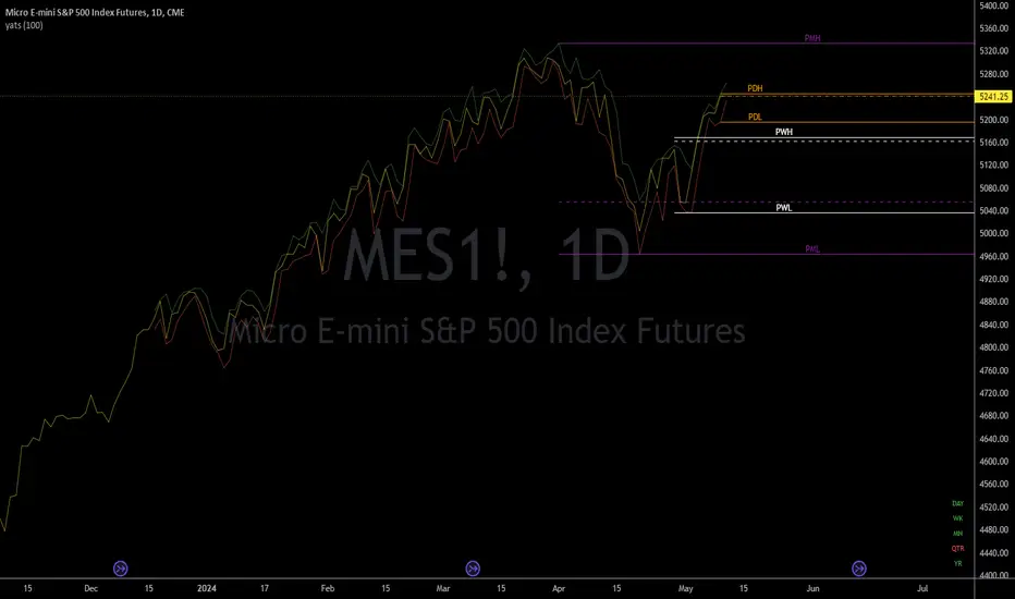 The indicator plots horizontal rays for the previous Day, Week, and Month for the High, Low, and Close. Day = Orange, Week = White, Month = Purple. High and Low are solid lines while Close is a dashed line.