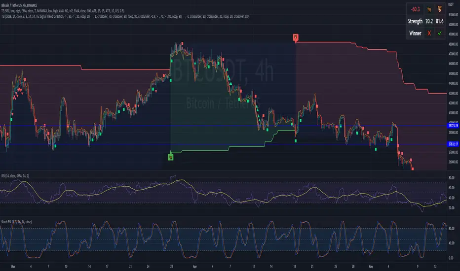 In this particular example I combined the RSI and Stoch RSI indicators (internal) with the "Trend Explorer" indicator (external) so it produces buy and sell signals based on the logic I defined in the input tab of this indicator. To combine "indicators on indicators" you need Pro+ TV subscription.