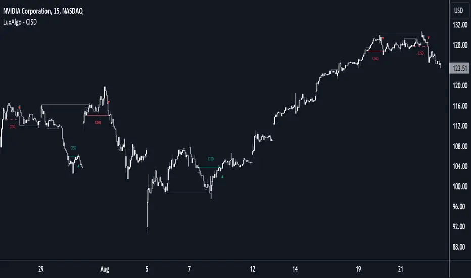 If a newly detected CISD aligns with the indicator's current established trend, this confirms a trend continuation (represented with a dashed line).