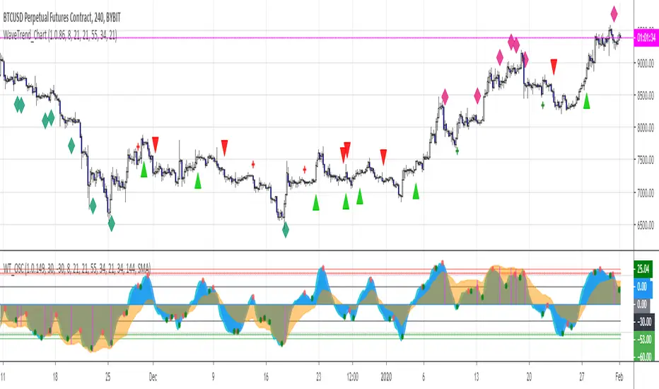 WaveTrend in it native oscillator form. Added various plots to help interpret the data better.