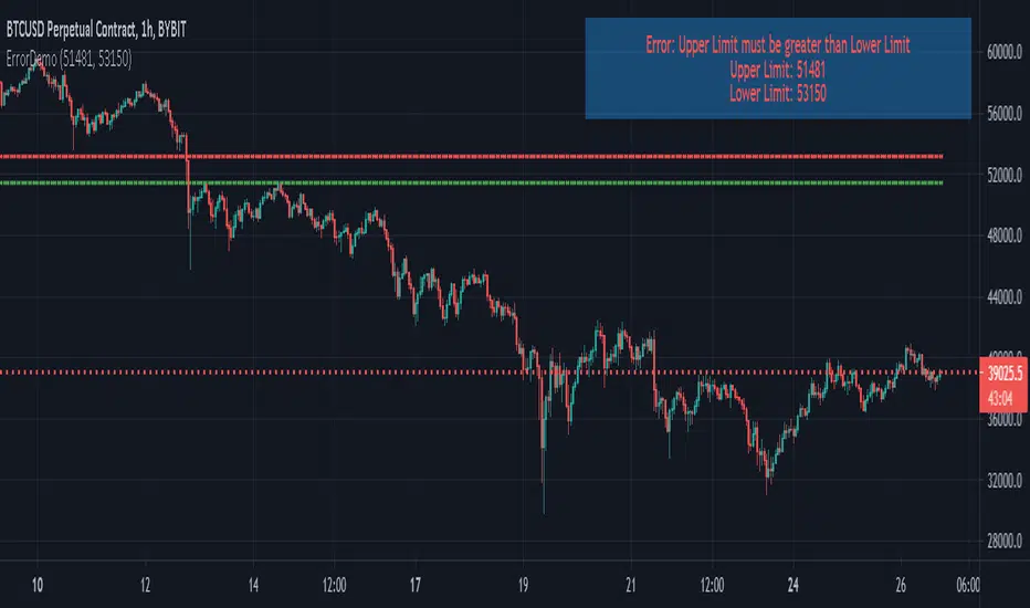 This script is proof of concept to display an “error message” to provide user feedback when valid, but non-logical variables are input by the end user. In this example, the user enters a lower limit that is greater than the upper limit. The Pinescript user input box allows input types and min/max values, but it does not allow input conditions like (Upper > Lower) for each variable. This script evaluates the user input and determines if the variables are logical. If not, it will print an error box using the new Pinescript table function.