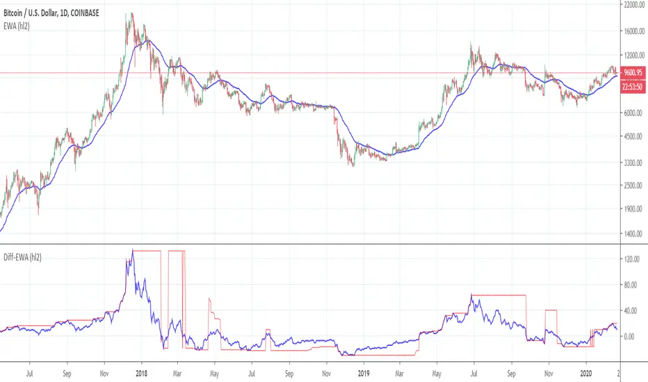 Implementation of Difference of Exponentially Weighted Averages in Pine Script. It can generate a line that adjust to the overall trend of a graphic. The lines that are generated in a new plot are the the Difference of Exponentially Weighted Averages (blue) and it binarization over the previous values.