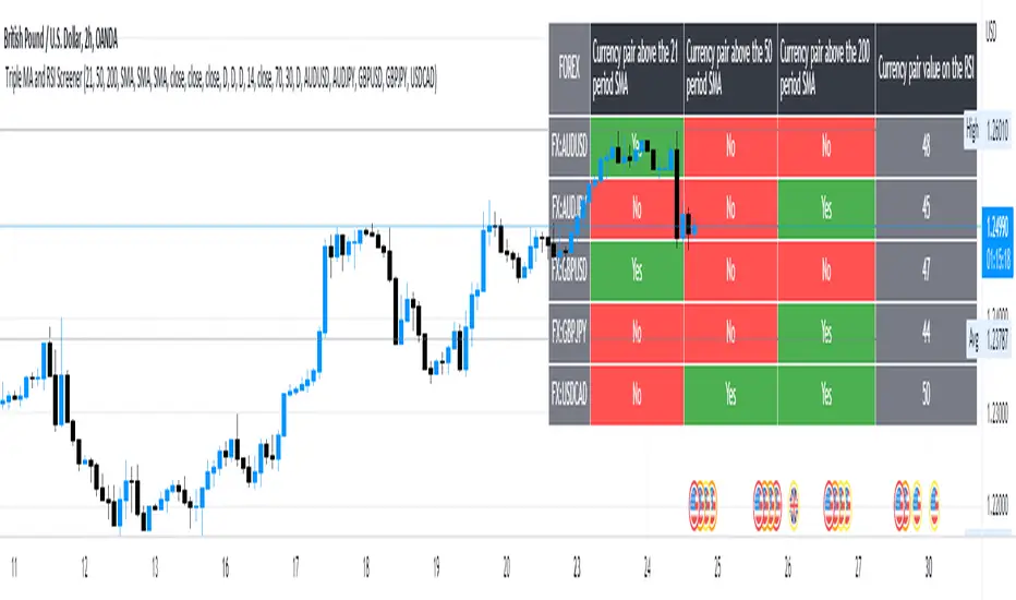 Below is a simple screener script fitted with 5 different symbols in the first column and in the other 4 columns the screener displays the respective moving averages and the RSI, the user has the ability to change between timeframes and different moving averages such as the SMA, EMA, RMA and WMA .