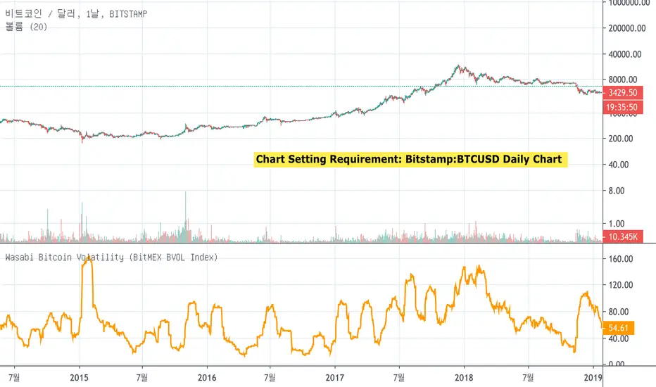 이 지표는 와사비의 비트코인 변동성 지수 입니다. 이 것은 비트맥스의 BVOL 인덱스 계산 방식으로 범용으로 다른 거래소에 적용하기 위해 만들었습니다.