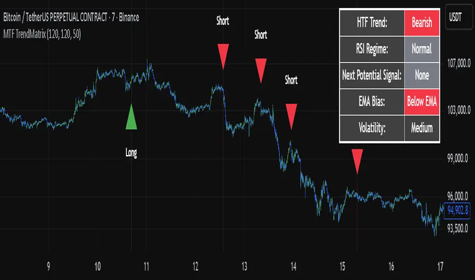 MTF TrendMatrix is a versatile, visual indicator designed to help traders quickly understand market trends and potential entry opportunities. It combines higher timeframe MACD, RSI signals, EMA confirmations, and volatility analysis into a compact, easy-to-read dashboard panel.