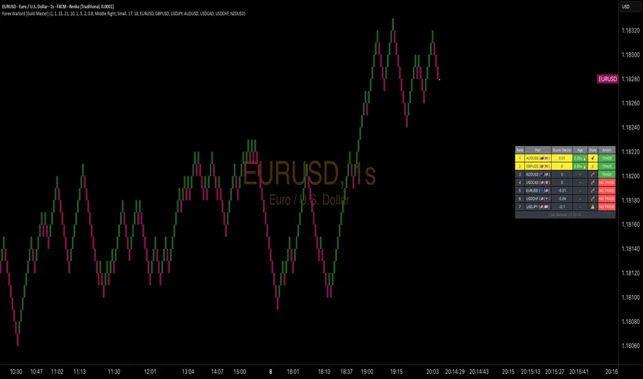 The script runs a "Virtual Renko" simulation on your time-based chart (works best on 1-second or 1-minute timeframes). It tracks price movement in "Bricks" and calculates a standardized "Score" for each pair.