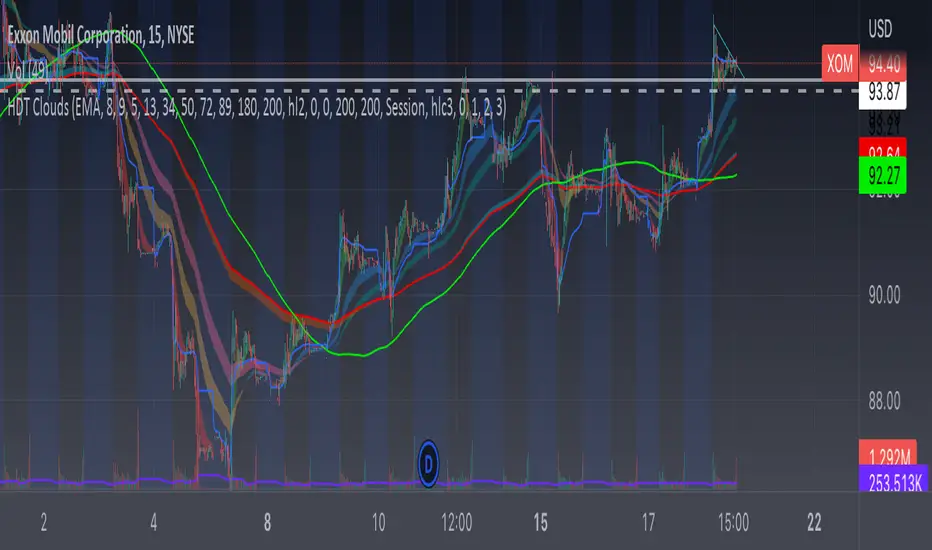 HDT Clouds combines custom clouds such as the 200EMA/MA cloud indicator to create high confluence bounce zones when combined with VWAP. The HDT indicator combines various clouds with the Volume Weighted Average Price indicator and Standard Deviations which allow users to identify areas on the chart where the stock may reverse.
