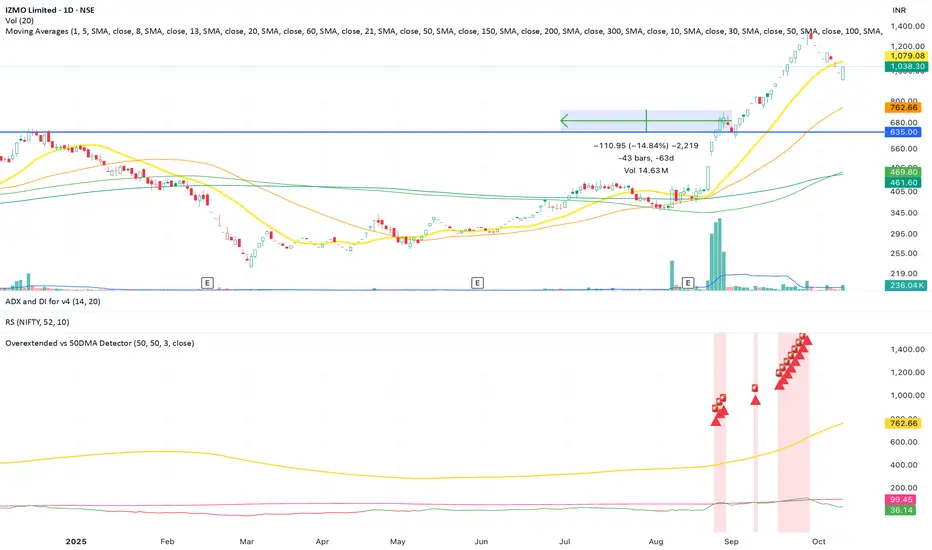 This indicator helps traders identify when a stock or asset becomes statistically overextended relative to its 50-day moving average (50DMA) — a key signal for potential pullbacks, consolidations, or profit-taking zones.