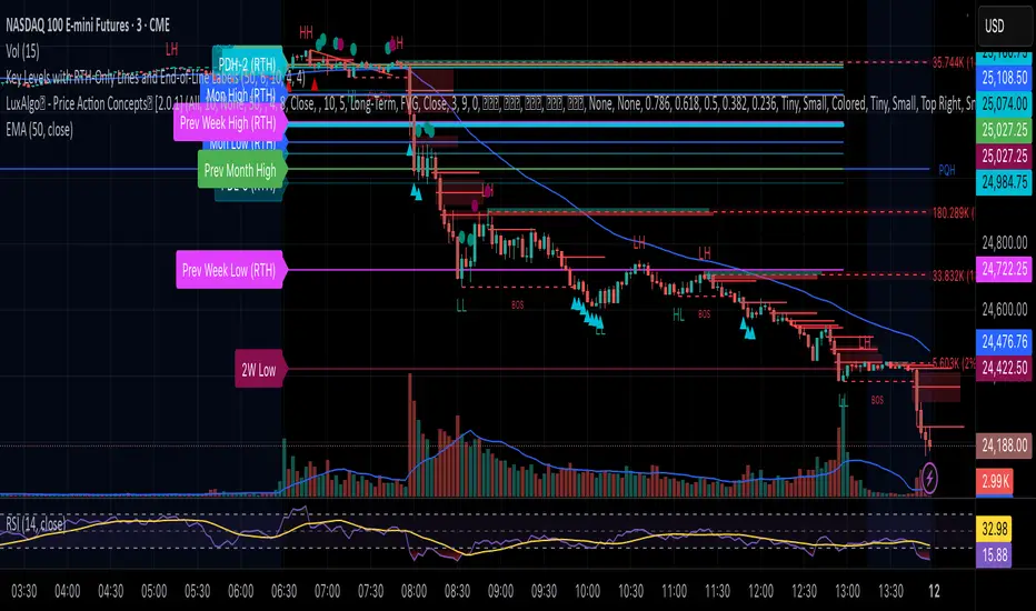 Each level is automatically updated based on session data and is visually extended across the current trading day using line breaks (plot.style_linebr). At the start of each RTH session, the script also places end-of-line labels identifying each level (e.g., PDH, PDL, Mon High, Mon Low, Weekly High/Low, Monthly High/Low), allowing traders to quickly reference key zones without clutter.
