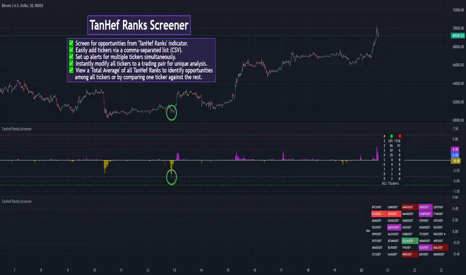 Set up alerts for individual ticker ranks or total average ranks. To avoid inconsistent or excessive alerts within a short period of time due to TradingView's alert frequency limits, it is recommended to use alerts set to occur at bar close to guarantee alerts. For immediate alerts, consider configuring them directly within the ‘TanHef Ranks’ indicator for better reliability. For the most up-to-date suggestions, hover the tooltips within the indicator’s alert settings.