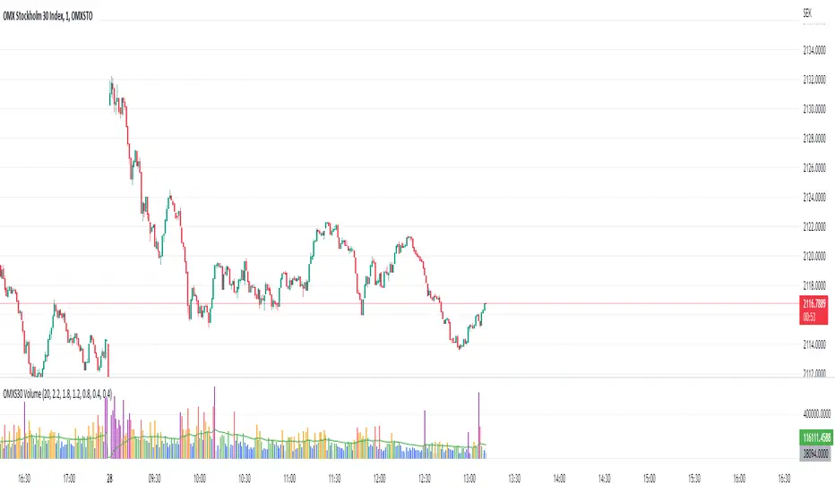 Updated version of the OMXS30 script now with the correct stocks. Also added functionality to color code the volume size in correlation to a volume moving average. Another function is to have two colors to indicate if the current bar volume is above or below the previous.Skrip sumber terbuka