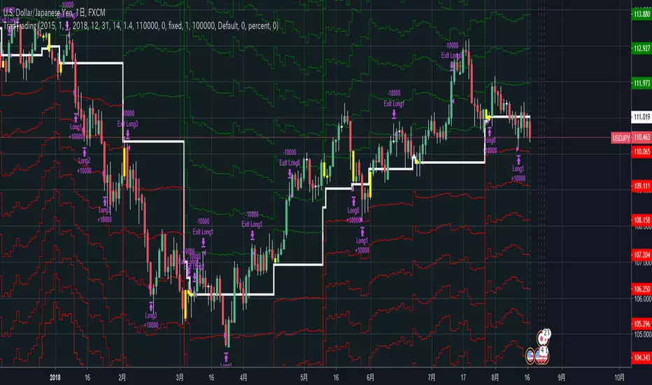 When the market price touches the white or the red(green) lines, buy(sell) orders are generated.