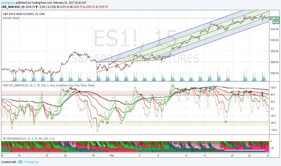 Fractal Composites normalize and 'cartoonize' the price chart to fit and bounce between statistically-defined overbought and oversold zones. Each lines resembles the shape of the price wave on a different time/size scale, with some distortion as the size of price movement fluctuates. Conceptually, reaching the overbought/oversold zone corresponds to price reaching a ribbon of Bollinger bands, though our 'band statistics' are much smoother and more mathematically sophisticated than standard Bollinger.