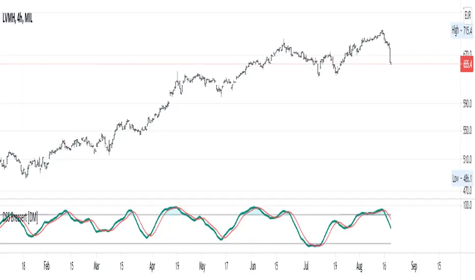 The application of the DSS is comparable with that of the stochastic method. Accordingly, values above 70 or 80 must be regarded as overbought and values below 20 or 30 as oversold. A rise of the DSS above its center line should be viewed as bullish, and a fall of the DSS below its center line as bearish.