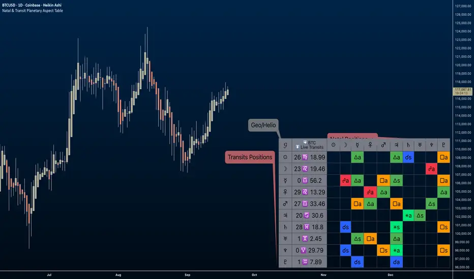 This open-source TradingView indicator displays a customizable table of astrological aspects between natal (first trade or custom date) planetary positions and current/live transits. Built in Pine Script v6, it leverages the AstroLib library for accurate geocentric or heliocentric longitude calculations, supporting a range of financial assets and historical events. Ideal for astro-finance enthusiasts, it highlights major and minor aspects with orbs, applying/separating status, and color-coded visuals. Supports 10 planetary bodies in geocentric mode (Sun, Moon, Mercury, Venus, Mars, Jupiter, Saturn, Uranus, Neptune, Pluto) or 11 in heliocentric mode (adds Earth).