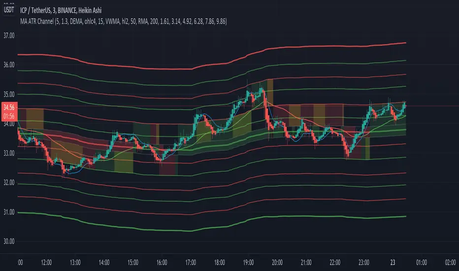 Average True Range - this is a way to measure and visualise range the price may be capable of in - if it is towards or below the 2.1 multiplier - a bull reversal is more likely and vice versea. The multi's are set to factors of Pi and Fibonacci ratio's. Green channel means bullish, red channel means bearish. Gold means sign of a likely reversal. If the PMA enters the channel - it is likely the reversal is cancelled for a short period more.