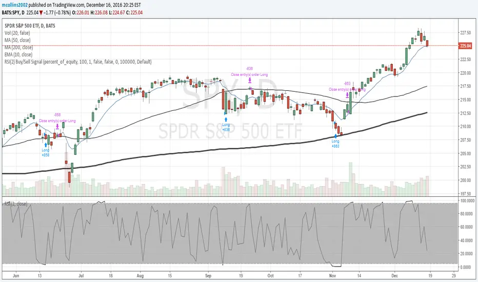 Long/Short entry signaling based on extreme RSI-2 values. The modeling indicates this a good strategy. It's possible to improve profitability by using discretion to enter trades at a more optimal price (i.e. close of the signaled day rather than the open of the following day) and to let the trades run a little longer, but I have not been successful in scripting those scenarios.