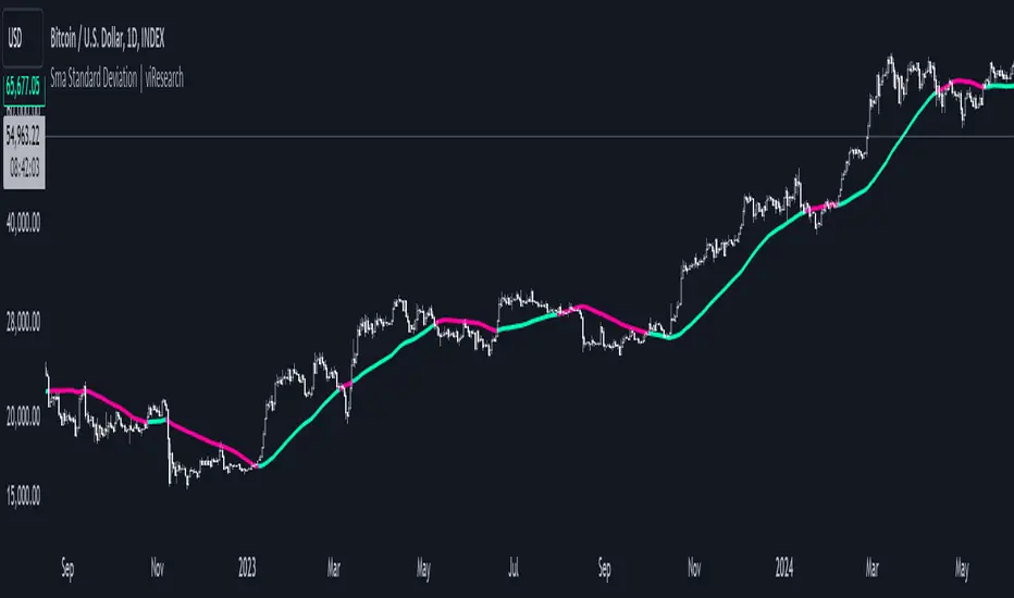 The "Sma Standard Deviation | viResearch" indicator provides traders with a robust tool for analyzing market trends and volatility. By combining the benefits of SMA smoothing with SD analysis, this script offers a comprehensive approach to detecting trend changes and managing risk. Incorporating this indicator into your trading strategy can help improve your ability to spot trend reversals, understand market volatility, and stay aligned with the broader market direction. The "Sma Standard Deviation" is a reliable and customizable solution for traders looking to enhance their technical analysis in both trending and volatile markets.
