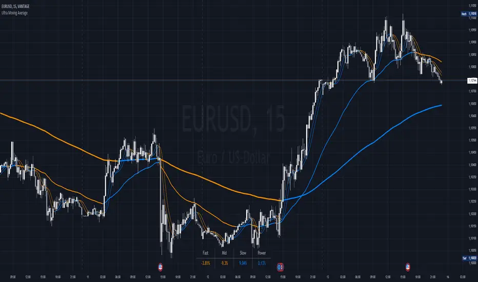 One of the unique features of the Ultra Moving Average is the trend strength table at the bottom of the chart. This table breaks down the strength of the fast, mid, and slow moving averages, displaying them as percentages. It also shows the overall "trend power," which helps assess how strong or weak the current trend is.
