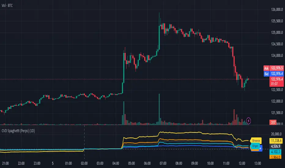 CVD Spaghetti – Multi-Exchange (Perpetuals) is designed to track and visualize Cumulative Volume Delta (CVD) across multiple cryptocurrency perpetual futures exchanges in one consolidated view. This indicator provides traders with a clearer perspective on buying and selling pressure by monitoring how order flow develops on different venues simultaneously.