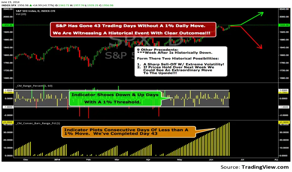 The S&P 500 has gone 43 trading days without a 1% daily move, up or down.