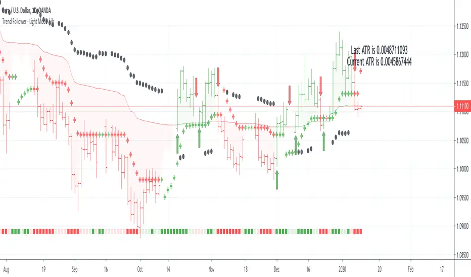 - White circles along the baseline, they will show up if the price has moved more than one ATR from the baseline