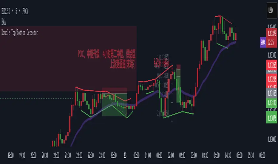 The Double Top/Bottom Detector is a technical analysis tool designed to automatically identify and label potential double top and double bottom patterns on price charts. By combining pivot point detection with configurable height tolerance and pullback depth criteria, this indicator helps traders visually spot possible trend reversal zones without manual drawing or guesswork.