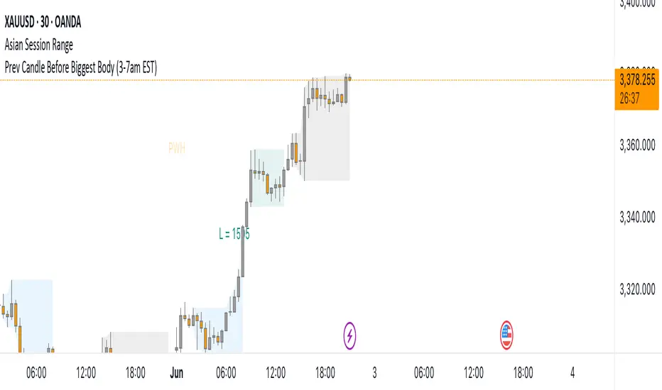 This indicator automatically identifies and marks, for each trading day, the candle immediately preceding the largest open-to-close movement (in pips) during the key London session window from 3:00am to 7:00am EST (New York time). The largest candle is determined by the absolute difference between its open and close prices, measured in pips. The candle just before this “biggest” move is highlighted with a distinctive pink flag above the bar. This tool is especially useful for traders seeking to analyze pre-breakout price action or to identify key levels and setups that occur right before significant volatility during the early London session.