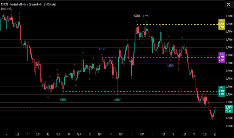 Smart Levels is an advanced support and resistance indicator that automatically identifies and displays the most significant price levels based on historical pivot points. Unlike simple pivot indicators, Smart Levels uses intelligent clustering and weighting algorithms to merge nearby extremums and highlight only the most reliable levels that matter for trading decisions.