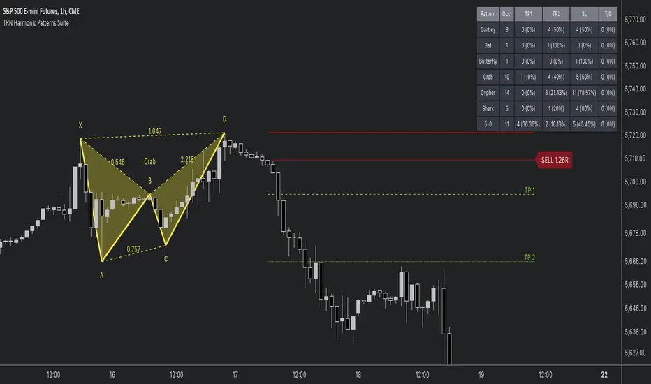 This indicator takes the time-consuming search for harmonic patterns completely off your hands. TRN Harmonics utilizes a unique swing-based pattern recognition to pinpoint 14 different harmonic patterns in real-time with unparalleled precision.