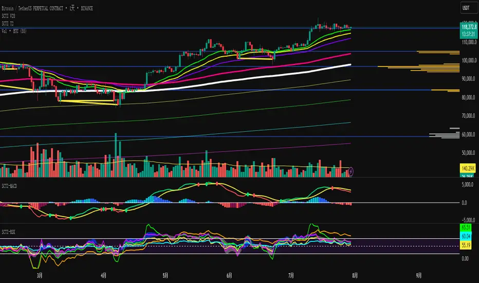 SCTI-MACD 旨在通过这些增强功能,将一个传统的指标转变为一个强大的市场分析工具,帮助您更精确地捕捉市场动量变化和潜在的趋势反转。