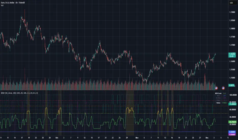 Unlike momentum or trend indicators that tell you what is happening, BEW tells you when something is about to change. It provides early warning of regime shifts before they occur, giving traders time to prepare for increased volatility or trend reversals.