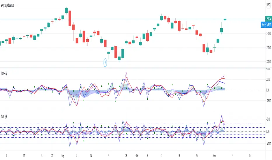 It is based on moving averages run on normal OHLC bars, Heikin Ashi bars as well as customized bars (which modify the open/high/low/close values similar to how Haikin Ashi bars do). These moving averages are weighted by volume and related to each other (for example differences are calculated) to produce the final lines. Since the script requires volume, it may not work for tickers which don't have volume (however for some tickers the script uses a proxy-volume so that they work; for example it uses the SPY volume for VIX). There is a different but similar script that I'll be publishing (ToW Simple) which doesn't use volume and runs on any ticker.