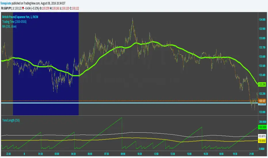 Script tries to capture the length of trends. It calculates an SMA and then determines the slope of the SMA using a simple momentum function. From there it counts bars from when the slope changed directions last. The lime green line is the count from when the slope changed. The yellow line is the average time of a trend. The white line is "trying" to capture the length of a full healthy pip running trend. Pick and SMA you like and then run through many currencies. I find that trends tend to be the same length. Not surprising as the markets are extremely correlated to each other. The trick is to find the most active pair for action. To do that look up my Pairs Range script.