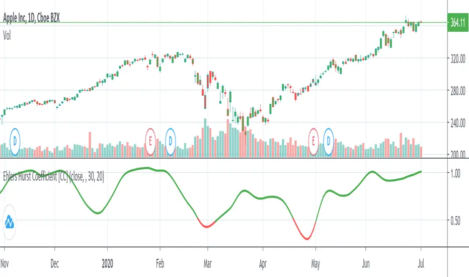 The Hurst Coefficient was created by John Ehlers (Cycle Analytics For Traders pgs 67-68) and this is a very useful indicator to tell you if the stock is in a uptrend or downtrend. Feel free to change the length to experiment and to adjust to your needs. Buy when the indicator line is green and sell when it is red.