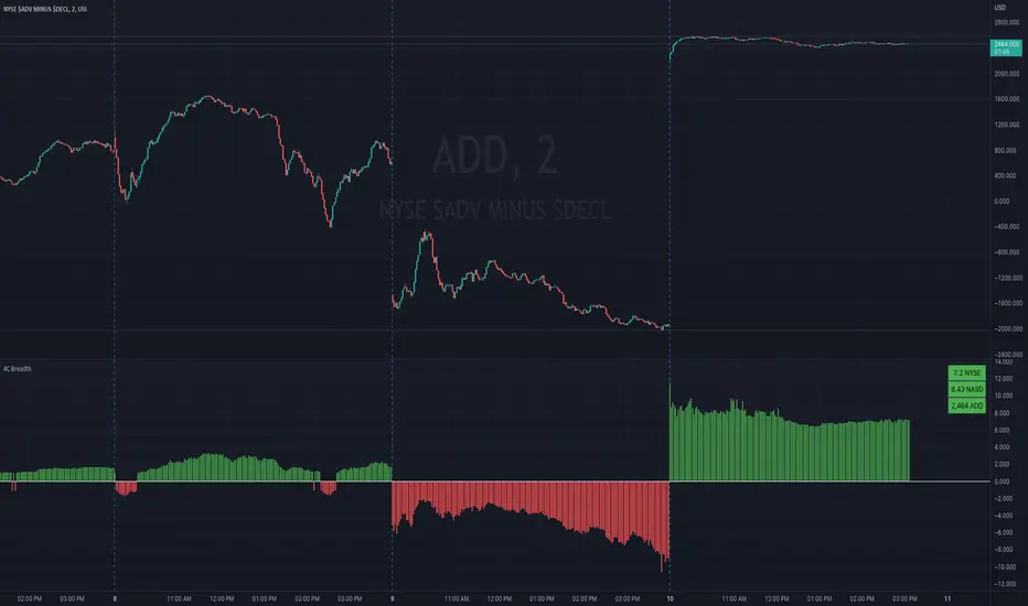 The 4C NYSE Market Breadth Ratio indicator is very useful when used with the ADD chart, and now makes it easier to see the ADD value alongside the Breadth Ratio values.