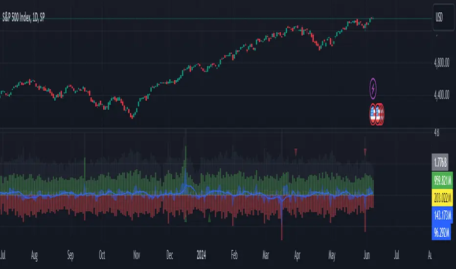 4. Volume Delta and its Moving Average: The volume delta (the difference between buying and selling volumes) is highlighted in blue, allowing for monitoring shifts in the balance of buying and selling power. Additionally, the indicator includes a moving average of the delta, shown as a blue line, to smooth out short-term fluctuations and help traders easily identify long-term trends in volume shifts.