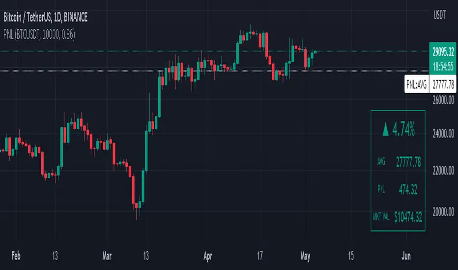 This is a manual profit and loss tracker. It takes the user's manual input of total cost and quantity, and then outputs a table on the bottom right of the chart showing the profit or loss %, average purchase price, gross profit or loss, and market value.