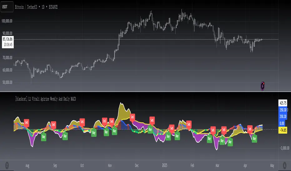 OVERVIEWThe [blackcat] L1 Vitali Apirine Weekly And Daily MACD indicator combines both daily and weekly Moving Average Convergence Divergence (MACD) calculations to provide a comprehensive view of market momentum across different timeframes. This script plots the MACD lines and histograms, generating alerts and labels for potential buy and sell opportunities. By analyzing the relationship between daily and weekly MACD values, traders can gain insights into short-term and long-term market trends 📈💹.