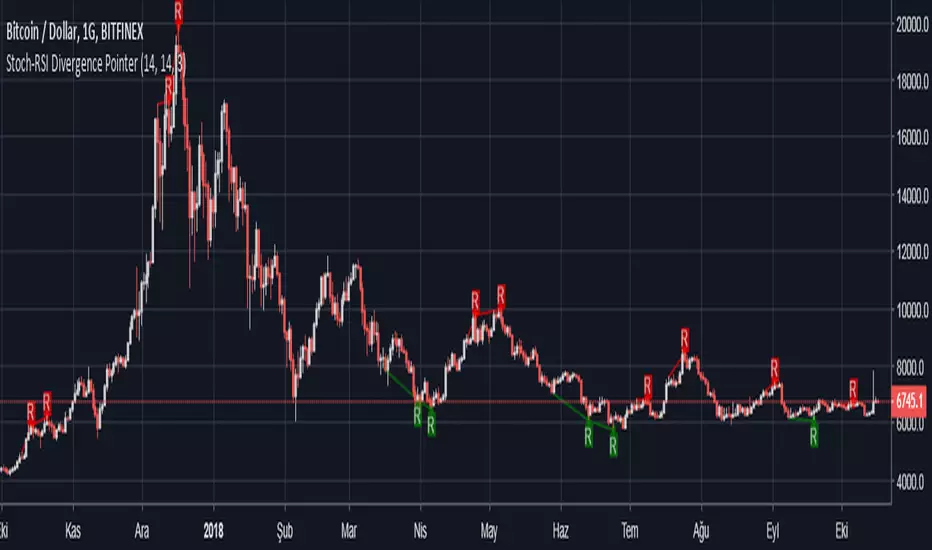 This script points regular and optionally hidden types of bullish and bearish Stoch-RSI divergences on the chart by drawing the divergence lines and optionally labels.