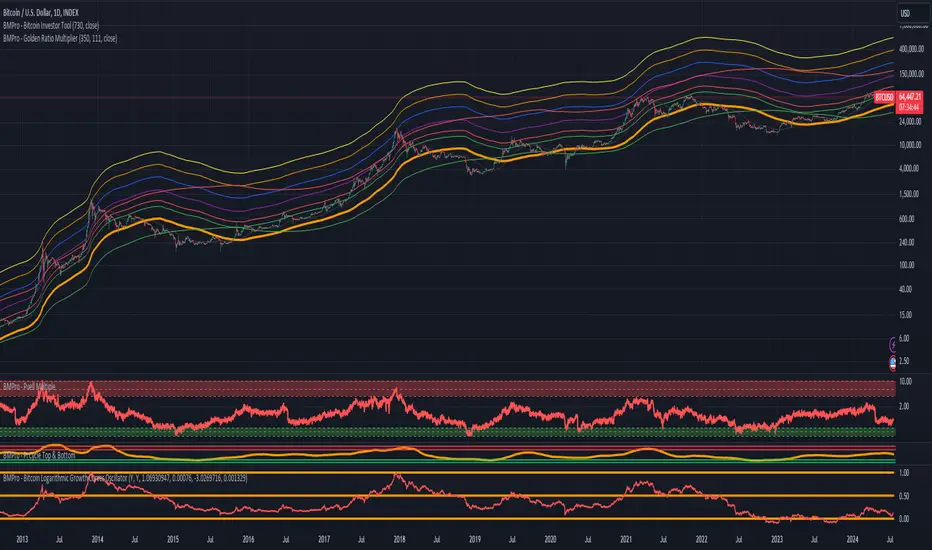 To do this, it uses a moving average line, the 2yr MA, and also a multiplication of that moving average line, 2yr MA x5.