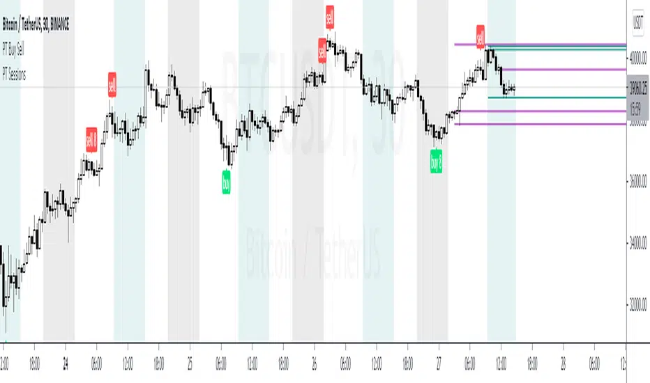 The main strategy to this indicator is to scalp long/short at each sessions open/close where we suspect volatility to be at its peek. The high/low of each session is usually put in at the open/close of the zone. This helps set the tone for the upcoming sessions & more so for the full day. This indicator works well for FX and Crypto but was built specifically around crypto volatility times.