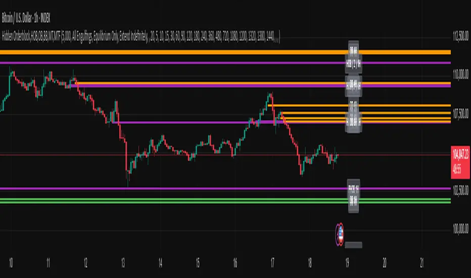 A powerful tool for Smart Money traders and ICT-style practitioners seeking precision, confluence, and clean visual execution. This indicator identifies institutional price zones such as Hidden Order Blocks (HOB), Breaker Blocks (BB), Partial Hidden Order Blocks (PHOB), and traditional Order Blocks (OB)—all across multiple timeframes with minimal chart clutter.