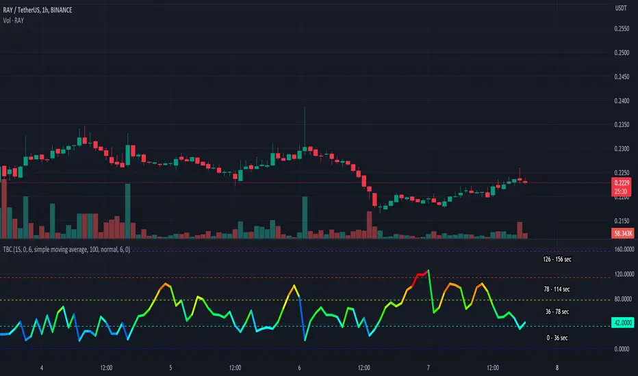 The Time Between Close (TBC) Indicator is designed to help traders visualize the time between candle closes in seconds. The timeframe option default is set to 1 second. This is in order to check how often a candle is produced on the one second timeframe regardless of what timeframe your chart is on. These values of time between candles are then averaged using the moving average length.