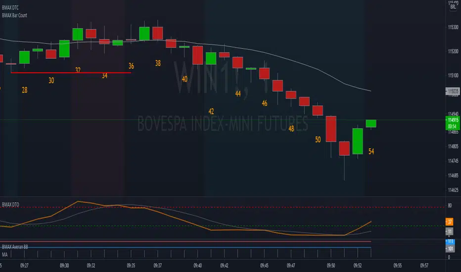 Este indicador foi criado para apresentar a numeração de candlesticks baseado em tempos gráficos intraday. Ele é limitado a 500 marcações portanto você tem a opção de escolher a cada quantas barras ele se apresenta, por exemplo apresentar contagem a cada 2 barras.