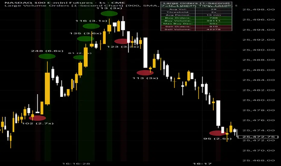 This indicator provides **approximate large order detection** on tick or 1-second charts only. It is not suitable for timeframes >1 second due to Pine Script limitations.