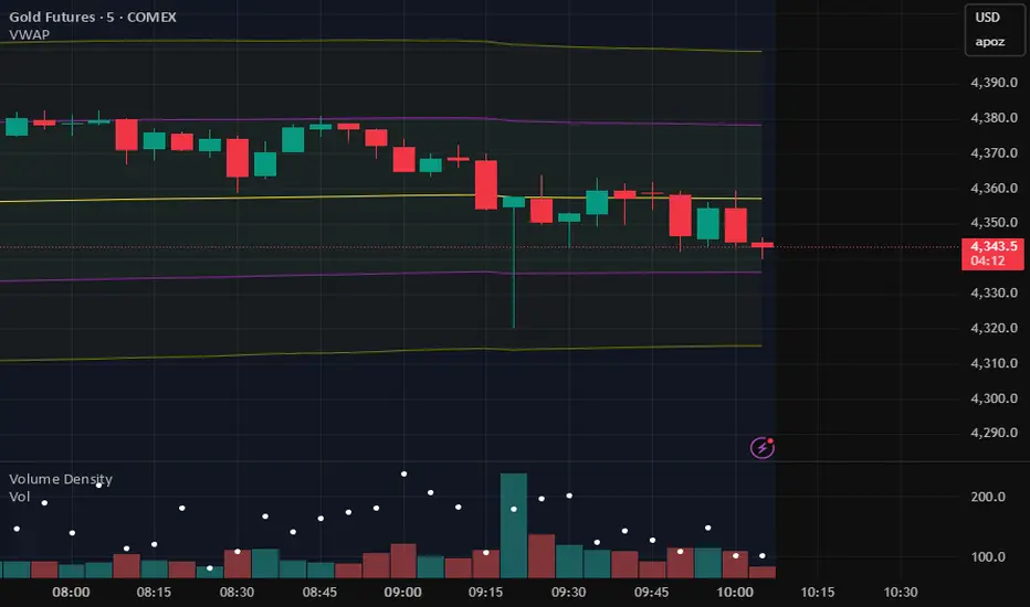 This indicator calculates the volume density of each bar by dividing the trading volume by the bar's price range (high - low). It highlights bars with higher activity relative to their price movement. Density bars are colored teal if the close is higher than the open, and red if the close is lower. Zero-range bars are ignored to prevent division errors.
