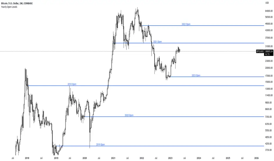 This script can be used in any market that has a yearly open price, such as stocks, futures, forex, and cryptocurrencies. However, it may be most useful in markets that tend to have significant year-to-year price movements, as it can help identify important levels of support and resistance. It may also be most effective in markets with a clear yearly cycle, such as those that tend to be influenced by seasonal factors.