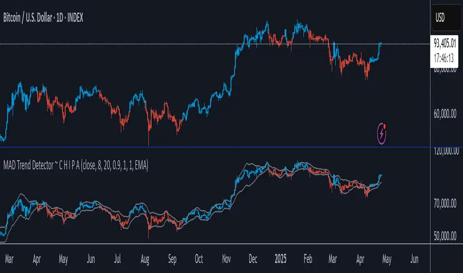 MAD Trend Detector ~ C H I P A is a custom trend detection tool designed to identify meaningful price deviations using Median Absolute Deviation (MAD) logic layered over a smoothed price baseline.