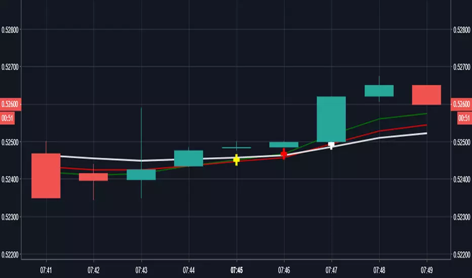 This is a short term EMA cross which is used primarily used for the 1HR chart and below perfect for highly volatile markets . Color coded for clear signals and easy to read crossovers strategy. I recommended for crypto currency trading or high volatility markets.